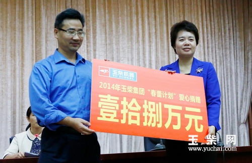 12月1日,玉柴集团2014年“春蕾计划”捐赠仪式在玉林市委党校礼堂举行,玉林市妇联主席倪惠宽代表受助女童,从玉柴集团党委副书记郭德明手中接过18万元捐助善款。