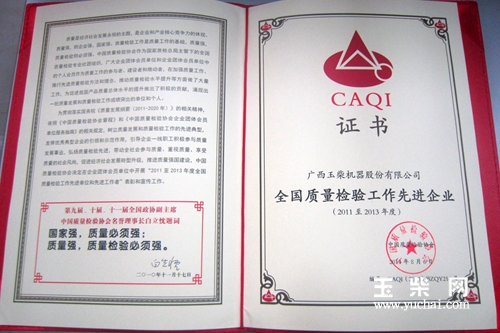 近日,从中国质量检验协会传来喜讯,广西玉柴机器股份有限公司荣获2011至2013年度“全国质量检验工作先进企业”称号。这既是玉柴股份在三年质量提升收官之年收获的可喜成果,也是2014年开启“二次创业”后对公司质量工作的一次有力鞭策。