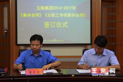 8月14日,玉柴集团举行集体合同签订仪式,职工方、行政方签订了2014-2017年集体合同和女职工专项集体合同。玉柴集团公司总裁古堂生代表集团公司行政方,玉柴股份总经理吴其伟代表玉柴股份行政方,分别与集团公司工会主席李呈杰代表的两司职工方在《集体合同》《女职工专项集体合同》文本上签字。