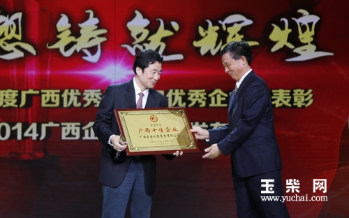 7月24日,由广西企业和企业家联合会主办,玉柴集团冠名举办的2013年度广西优秀企业和企业家表彰暨2014年广西百强企业发布庆典在邕举行,庆典上,自治区国资委主任管跃庆向玉柴集团董事局主席晏平颁发了“广西十佳企业”、“广西十佳企业家”牌匾。集团副总裁周孙海代表玉柴领取2014年广西百强企业牌匾。