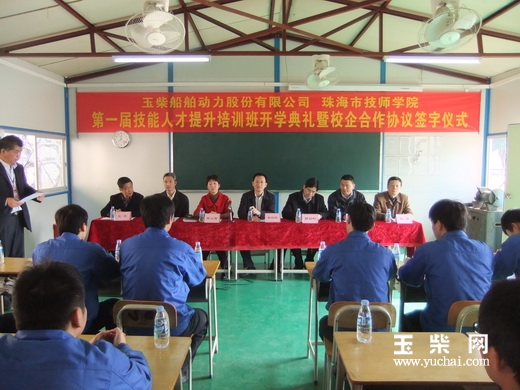 1月16日,玉柴船动与珠海市技师学院共同举行了首届技能人才培训班开学典礼暨校企合作协议签订仪式,珠海市人力资源与社会保障局局长李伟辉、玉柴船动副总经理郑劲松、技师学院高小霞院长等领导出席了仪式,玉柴船动首批13名钳工学员参加仪式。郑劲松与高小霞代表合作双方在协议上签字,双方就技能人才培养领域正式建立合作关系。