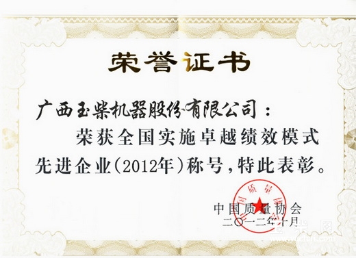 此次,来自全国29个省、自治区、直辖市和特别行政区的企业参与申报“全国实施卓越绩效模式先进企业”奖。玉柴股份公司作为机械行业为数不多的发动机专业生产企业,多年来一直致力于卓越绩效模式的实施。尤其是今年以来,在广西自治区主席质量奖、玉林市市长质量奖等评选中,作为广西率先导入卓越绩效模式的企业,玉柴股份公司在竞争中占尽先机,成为行业标杆。