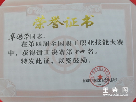 玉柴制造技术部职工覃懋华参加由中华全国总工会、科学技术部、人力资源和社会保障部、工业和信息化部联合举办的第四届全国职工职业技能大赛钳工决赛第十四名,这是玉柴职工参加此类比赛历史最好成绩。