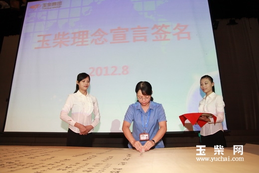 玉柴一直以来十分重视企业文化建设工作,其企业文化建设以“绿色”、“创新”、“自强”、“和谐”、“责任”、“卓越”、“精益”、“共赢”等8大关键词为体系,特色鲜明,成效突出。前不久,玉柴刚获得了由中国企业文化研究会颁发的“全国企业文化建设示范基地”的称号。本次借新员工入职培训之机,开展企业文化理念宣言、签名活动,正是落实玉柴企业文化建设“领导重视、全员参与”的基本思路的表现。
