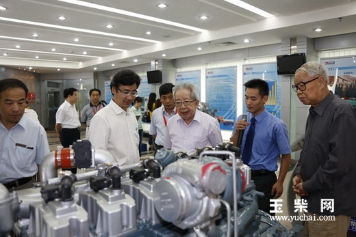 胡平(前中)一行在发展历史展区了解玉柴发动机产品