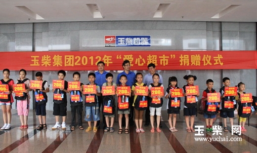 当天下午,玉柴2012年“爱心超市”捐赠仪式在文化中心大厅举行,李天生、郭德明、叶斌等分别给39名来自集团各单位的困难职工家庭子女送上了捐赠品,及每人200元的慰问金。同时,李天生等公司领导为部分就读于其他学校的、获得玉柴2012年“五好少年”称号的学生颁发了证书,并送上了礼物。