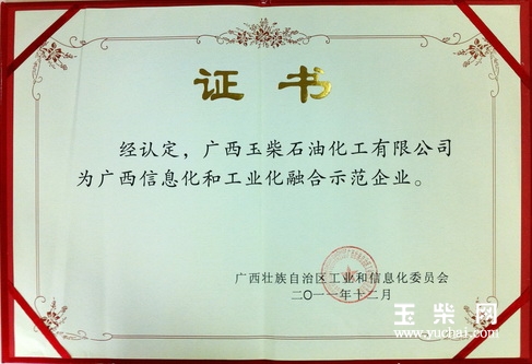近日,广西玉柴石油化工有限公司荣获自治区工信委颁发的“广西信息化与工业化融合示范企业”荣誉,钦州市仅有三家企业获得该项荣誉。