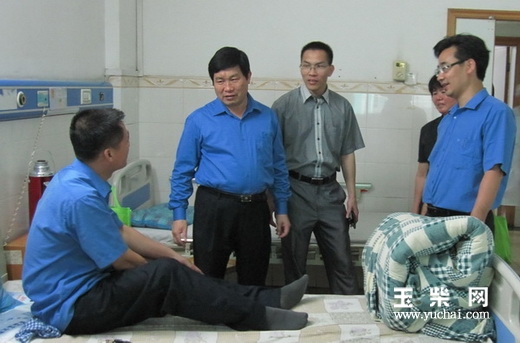 五一前夕的4月27日上午, 玉柴集团公司党委副书记李天生、郭德明、关敏,工会主席梁萍,股份公司党委副书记叶斌等领导兵分三路到玉林市各个医院为生病住院的职工送上温暖的节日关怀。