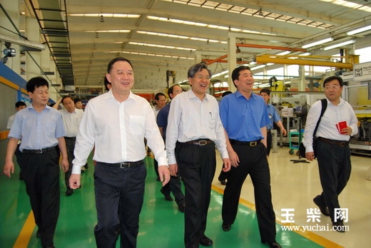 谢国明(前排右三)一行参观玉柴重机装配生产线