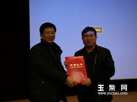 梁卫东(左)给玉柴集团颁发“玉林市2011年度新闻报道工作一等奖”证书