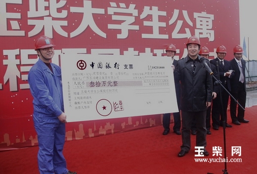 封顶仪式上,晏平还履行半年前的承诺,向提前完成主体工程封顶的施工单位——广西五鸿建设集团有限公司颁发了奖金30万元,以感谢该单位为玉柴大学生公寓项目建设所做出的卓越贡献。