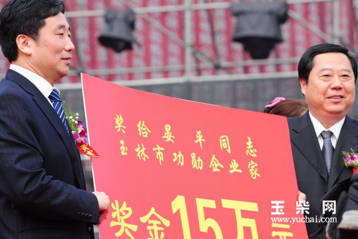 近几年来玉柴保持高速增长态势,对玉林经济发展起到了举足轻重的作用。玉柴集团公司董事局主席晏平在组织、领导企业改革和发展过程中,团结带领公司领导班子成员和全体职工创业创新,在公司结构调整、强化管理、技术进步、转变发展方式等方面业绩显著,作用突出。为此玉林市委、市政府决定授予晏平“玉林市功勋企业家”荣誉称号。玉林市市长韩元利代表市委市政府为晏平颁发了奖金15万元。