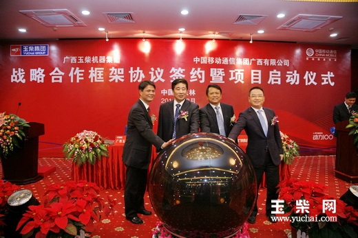中国移动广西公司总经理顾雄、玉柴集团公司董事局主席晏平出席签约仪式并致辞。玉柴集团公司总裁古堂生、中国移动广西公司副总经理何志力分别代表双方企业签署了战略合作协议。顾雄、晏平、古堂生、何志力共同启动了合作项目。宁兴勇、王炜、韩义勇等玉柴股份公司领导见证了签字和项目启动仪式。