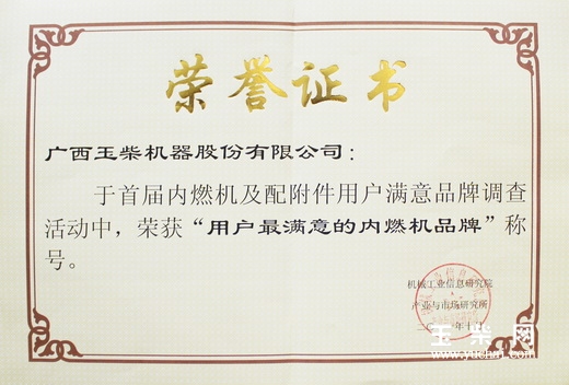 2011年10月7-8日,在京陆续召开的中国内燃机工业协会四届五次理事(扩大)会议暨内燃机工业高峰论坛、第十届中国国际内燃机及汽车零部件展览会、首届内燃机及配附件采购商洽谈会等会议上,玉柴集团荣获“用户最满意的内燃机品牌”称号,该荣誉经由广大用户投票评选产生。