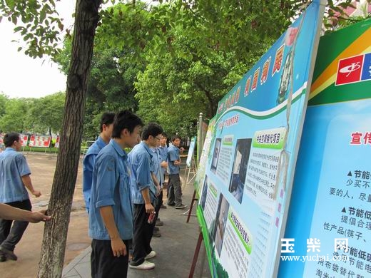 玉柴在玉柴大道、各工厂、生活小区挂节能宣传标语;开展以“四个一”(节约一滴水、节约一度电、节约一张纸、节约一粒米)为主要内容的主体实践倡议活动;鼓动、引导职工增强资源节约意识,强化职工节能减排实践;组织各工厂和部门参加生产部主办的节能知识答题竞赛活动;开展以“节能”为主题的电子板报竞赛以及在厂区展示各单位近几年来的节能技术革新成果。