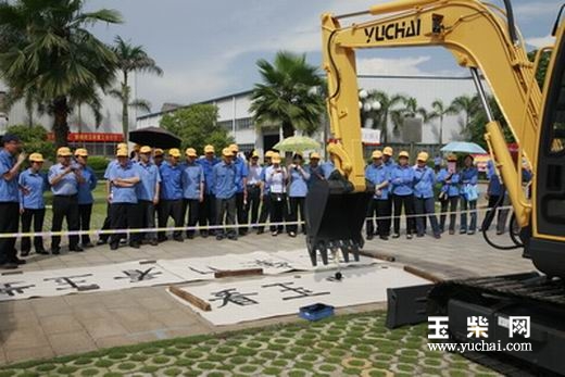 职工代表对玉柴重工的挖掘机书法表演兴趣浓厚