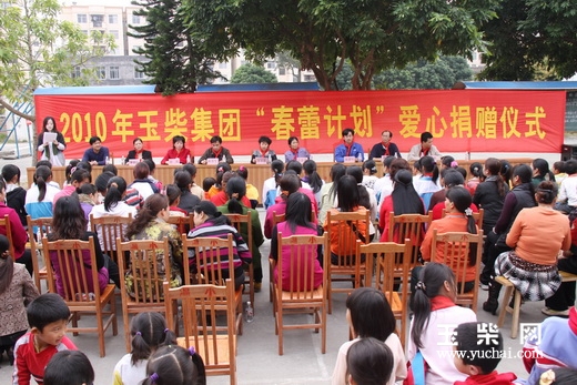 扶一株春蕾,争一份春光,助一名女童,赢一片希望。12月24日下午,玉柴集团在陆川县温泉小学举行2010年“春蕾计划”爱心捐赠仪式。玉柴集团党委副书记张嘉莎,玉林市妇联党组书记、主席唐青莉,玉柴集团理事会秘书长郭德明,陆川县常委、组织部部长林茂生等领导出席了捐赠仪式。