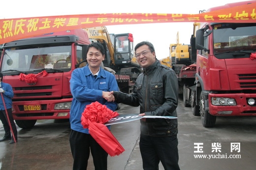 张士勇总经理将挖掘机钥匙模型交付至奉金华总经理处,并与边德军一同进行简单而隆重的剪彩。随着张士勇宣布起运的号令,礼炮响起,彩带飞扬,在激情的音乐声中,一辆辆载着玉柴重工挖掘机的卡车缓缓启程,带着玉柴重工人的希望漂洋过海远赴巴西。