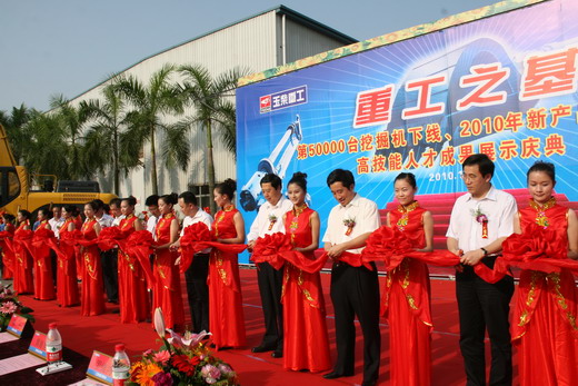 10月23日下午,玉柴重工第50000台液压挖掘机在玉林生产基地成功下线。玉林市委书记金湘军,玉柴集团公司董事局主席、玉柴重工公司董事长晏平为玉柴重工第50000台液压挖掘机下线揭幕。同时,玉柴重工还有12款2010年新产品下线,中国工程机械工业协会挖掘机械分会秘书长李宏宝,玉林市委书记金湘军,市长韩元利,副市长田壮,人大常委会副主任罗维鸿,市委常委、秘书长黄海昆,玉柴集团公司董事局主席晏平,市政府秘书长马雄光,陆川县委书记禤甲军,陆川县县长莫荣新,玉柴集团公司总裁古堂生等领导共同为新产品下线剪彩。下线仪式由玉柴重工总经理张士勇主持。