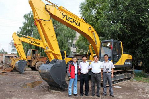 山东公路系统领导在捐赠的两台玉柴挖掘机前合影