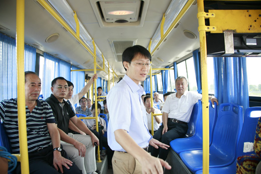 王秉刚(右一)等专家亲身体验装配玉柴混合动力发动机公交车的运行情况,图为玉柴梁锋博士向专家组介绍发动机运行性能