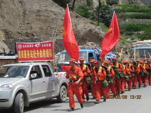 玉柴陇南服务站距离舟曲县城90多公里,救援物资及工作人员准备就绪后,即开赴灾区。G212线及313线各路段已有大批车辆运送救灾物资和来自四面八方的救援队,排成长龙。