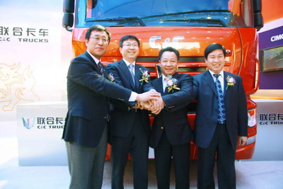 4月23日,由中集集团、奇瑞汽车、玉柴集团合力打造的联合卡车在第十一届北京国际汽车展精彩亮相。中集集团总裁麦伯良、奇瑞汽车董事长尹同跃、玉柴集团公司董事局副主席李天生、集瑞联合重工副董事长李胤辉共同出席了U460重卡的揭幕仪式。参加揭幕仪式的领导还有:集瑞联合重工副总唐刚、涂小岳,玉柴股份公司副总经理吴其伟,玉柴联合动力公司总经理梁和平,玉柴股份公司副总经理钟玉伟、副总设计师覃文、技术总师许国卫、产品副总规划师杨永群、陶泽民博士。安徽省及芜湖市有关领导也到场参观了展车和展机。