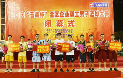 当晚,自治区总工会党组书记、副主席吴玉斌,中共玉林市委副书记刘子福,市人大常委会副主任、市总工会主席张福文等领导,玉柴集团公司总裁古堂生、党委副书记张嘉莎、股份公司党委书记梁萍、集团公司工会主席饶英贤等领导出席闭幕式并为获奖单位篮球队颁奖。大会还颁发了体育道德风尚奖、优秀组织奖、最佳组织奖、特别贡献奖。其中,玉柴集团作为承办单位,组织有方,成功举办此次比赛,因此获特别贡献奖、体育道德风尚奖两项殊荣。玉柴集团公司总裁古堂生、集团理事会秘书长郭德明代表玉柴领取奖杯奖牌。