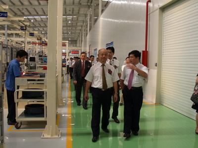 丁国炎在(前左一)在李天生陪同下参观厦门玉柴公司生产车间