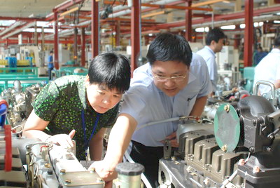 田永红(左)对玉柴发动机产生浓厚兴趣