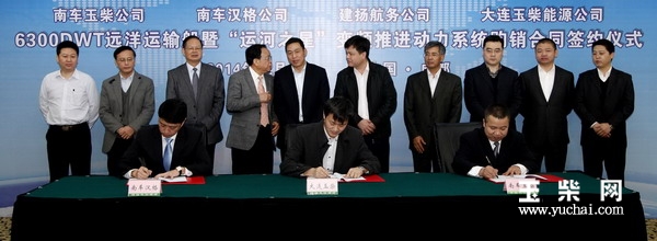 近日,南车玉柴四川发动机股份有限公司、上海南车汉格船舶工程有限公司分别与浙江建扬航务工程有限公司、大连玉柴能源有限公司签订了6300DWT远洋运输船及“运河之星”示范船变频推进动力系统购销合同。中国南车集团副总裁徐宗祥、广西玉柴集团副总裁周孙海、中国船舶工业协会顾问王锦连、CCS重庆分社副总经理唐建、南车玉柴董事长张正清等分别在仪式上致辞,南车玉柴总经理杨战明主持签约仪式。