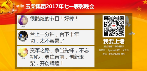 晚会以“微信上墙”的形式与观众进行互动,观众通过微信墙纷纷留言,表达了对党的成立和玉柴美好未来的殷切盼望和祝福,现场气氛空前高涨。