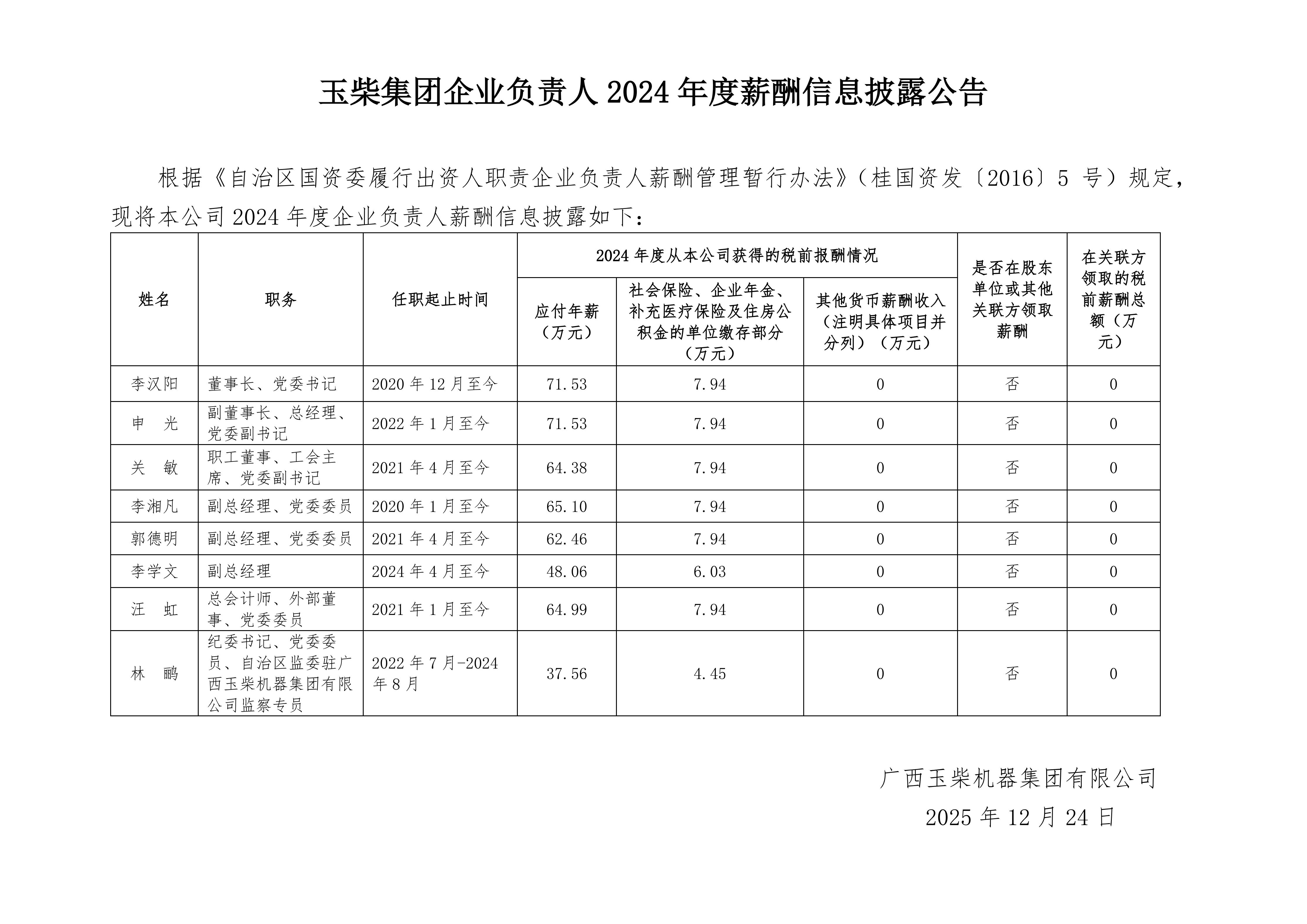 玉柴集团企业负责人2024年度薪酬信息披露公告